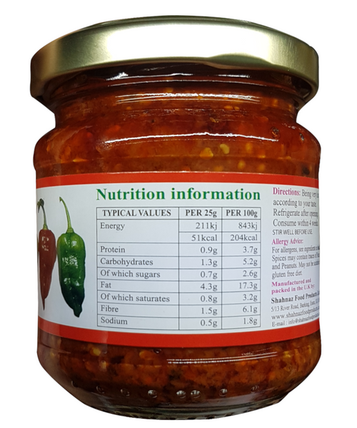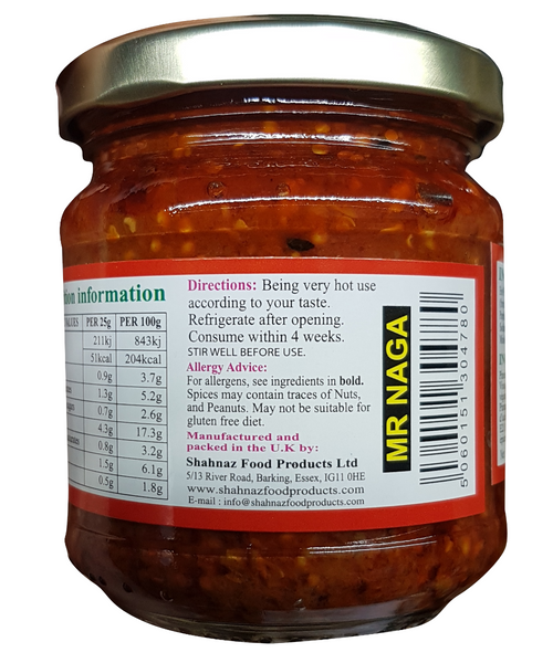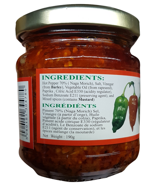 Ingredients: Hot Pepper 70% (Naga Morich), Salt, Vinegar (from Barley), Vegetable Oil (from rapeseed), Paprika, Citric Acid E330 (acidity regulator), Sodium Benzoate E211 (preserving agent), and Mixed spices (contains Mustard )