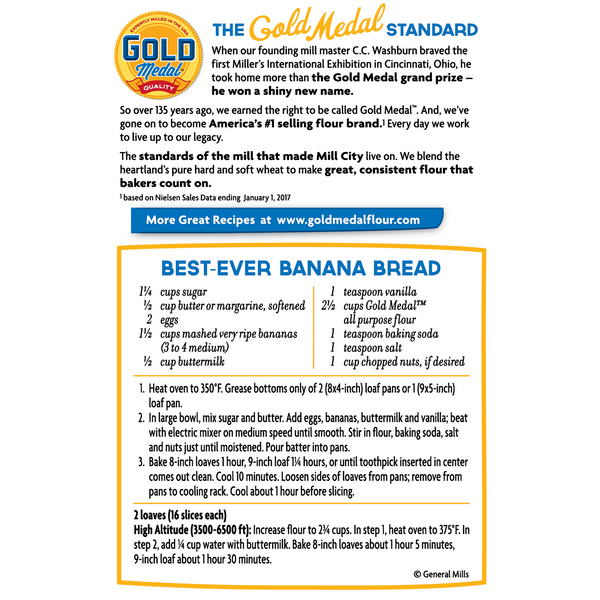 All purpose means just that --our most versatile flour for any recipe that simply calls for "flour." Strong enough to take high-rising yeast breads to new heights. And mellow enough to make your family's favorite pie crust recipe to flaky perfection (even without sifting). Gold Medal All Purpose is made of the stuff you can trust. A blend of pure white hard and soft wheat so every bite looks and tastes its absolute best.