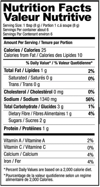 Himalayan Pink Salt, Garlic, Ginger, Cumin, Bay Leaf, Brown Cardamom, Cinnamon, Carom, Green Cardamom, Clove, Red Chili, Cane Sugar, Coriander, Turmeric, Hydrolyzed Soy Protein, Maltodextrin, Canola Oil, Natural and Artificial Food Flavor, Silicon Dioxide (Anticaking Agent)
