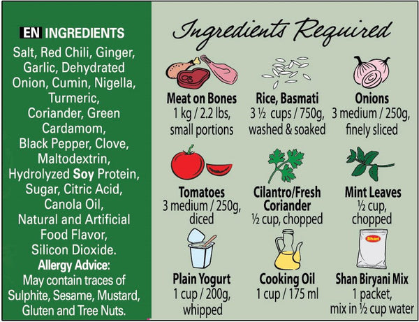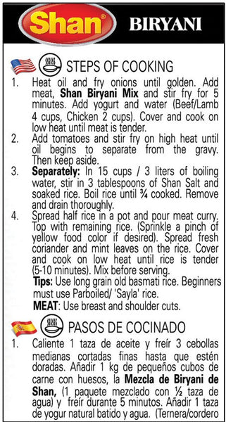 - Heat oil and fry onions until golden. Add meat, Shan Biryani Mix and stir fry for 5 minutes. Add yogurt and water (Beef/Lamb 4 cups, Chicken 2 cups). Cover and cook on low heat until meat is tender.