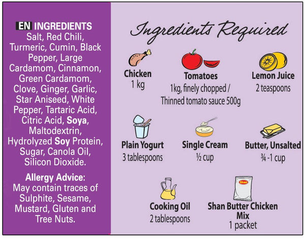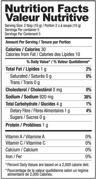 Salt, Red Chili, Turmeric, Cumin, Black Pepper, Large Cardamom, Cinnamon, Green Cardamom, Clove, Ginger, Garlic, Star Aniseed, White Pepper, Acid: Tartaric Acid & Citric Acid, Soya, Maltodextrin, Hydrolyzed Soy Protein, Cane Sugar, Canola Oil, Anticaking Agent: Silicon Dioxide