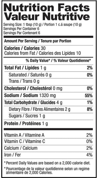 Salt, Turmeric, Paprika, Red Chili, Dill Seed, Green Cardamom, Black Pepper, Clove, Brown Cardamom, Cumin, Allspice, Ginger, Garlic, Dried Papaya Powder, Acid: Citric Acid, Maltodextrin, Hydrolyzed Soy Protein, Cane Sugar, Canola Oil, Anticaking Agent: Silicon Dioxide, Natural And Artificial Food Flavor.