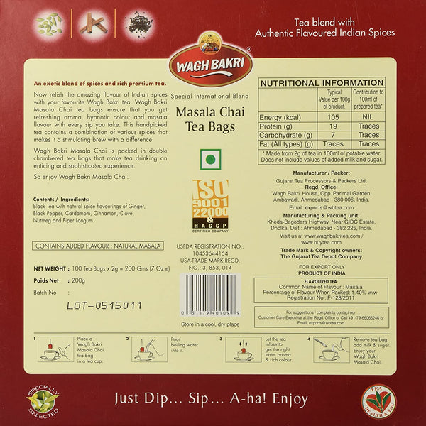 Now relish the amazing flavor of Indian spices with your favorite Wagh Bakri Tea. Wagh Bakri Masala Chai tea bags ensure that you get refreshing aroma, hypnotic colour and masala flavour with every sip you take. This handpicked tea contains a combination of various spices that makes it a stimulating brew with a difference. Wagh Bakri Masala Chai is packed in double chambered tea bags that make tea drinking an enticing and sophisticated experience.