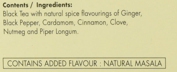 Black tea with natural spice flavourings of Ginger, Black pepper, Cardamom, Cinnamon, Clove, Nutmeg and Piper Longum.