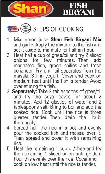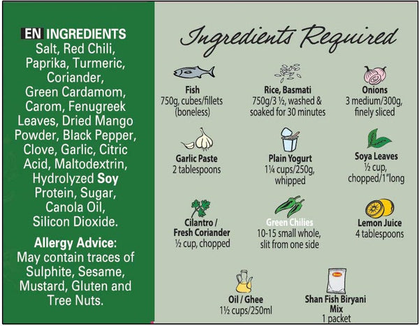 - Mix lemon juice Shan Fish Biryani Mix and garlic. Apply the mixture to the fish and set it aside to marinate for half an hour.