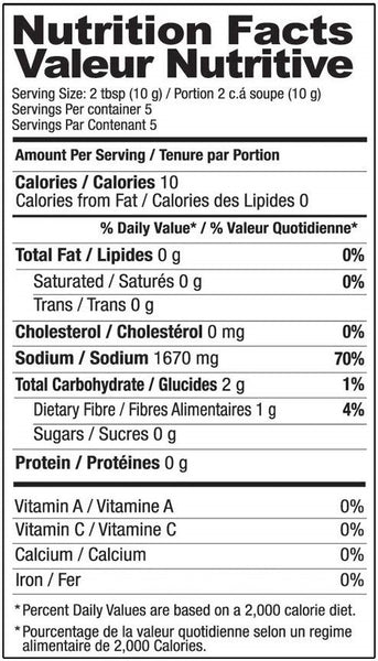 Salt, Red Chili, Paprika, Turmeric, Coriander, Green Cardamom, Carom, Fenugreek Leaves, Dried Mango Powder, Black Pepper, Clove, Garlic, Acid: Citric Acid, Maltodextrin, Hydrolyzed Soy Protein, Cane Sugar, Canola Oil, Anticaking Agent: Silicon Dioxide